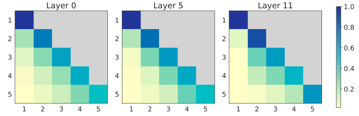 (iii) Despite focusing most heavily on the current scale, the model still retains non-negligible attention to earlier scales.