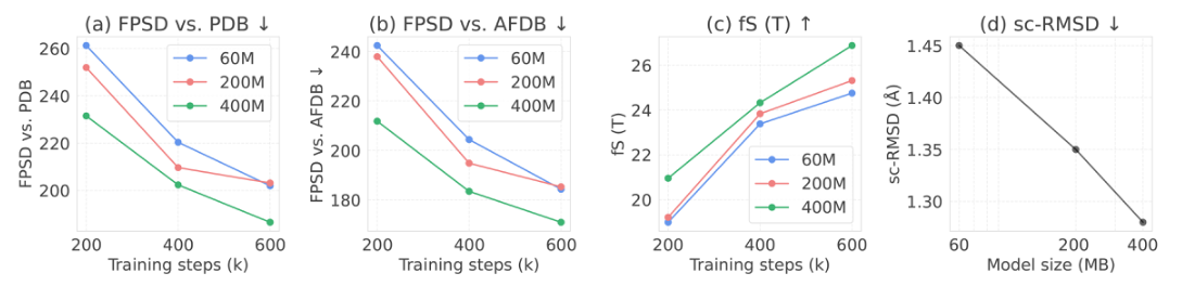 Figure 5: Scaling effects of PAR. Performance of four metrics over varying training steps and model sizes: (a) FPSD vs. PDB, (b) FPSD vs. AFDB, (c) fS(T), (d) sc-RMSD.